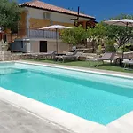 Azienda Agrituristica Fattoria Terra e Liberta Farmから2km離れたところにあるベッドルーム1室のVilla Leonardo Canicattini Bagniには、プールの景色を望むテラスがあります。